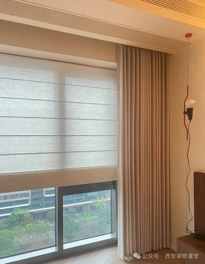 3.罗马帘透光+布帘:这样搭配是可以的,适合于满墙大窗户的户型,罗马帘作为氛围透光代替纱帘使用,比拖沓纱帘更精致。(推荐做法)
