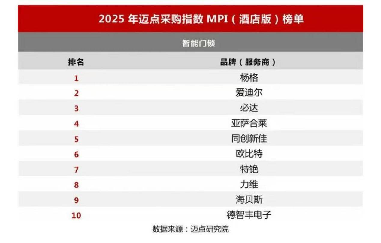 正因这份对品质的极致执着、对客户的纯粹真诚,2025 年,杨格锁业凭硬核市场表现与产品实力,斩获迈点研究院权威市场调研认证的 “酒店锁十大品牌” 殊荣!这份荣誉,既是行业赋予的高度肯定,更是市场与万千酒店用选择投票的硬核佐证。