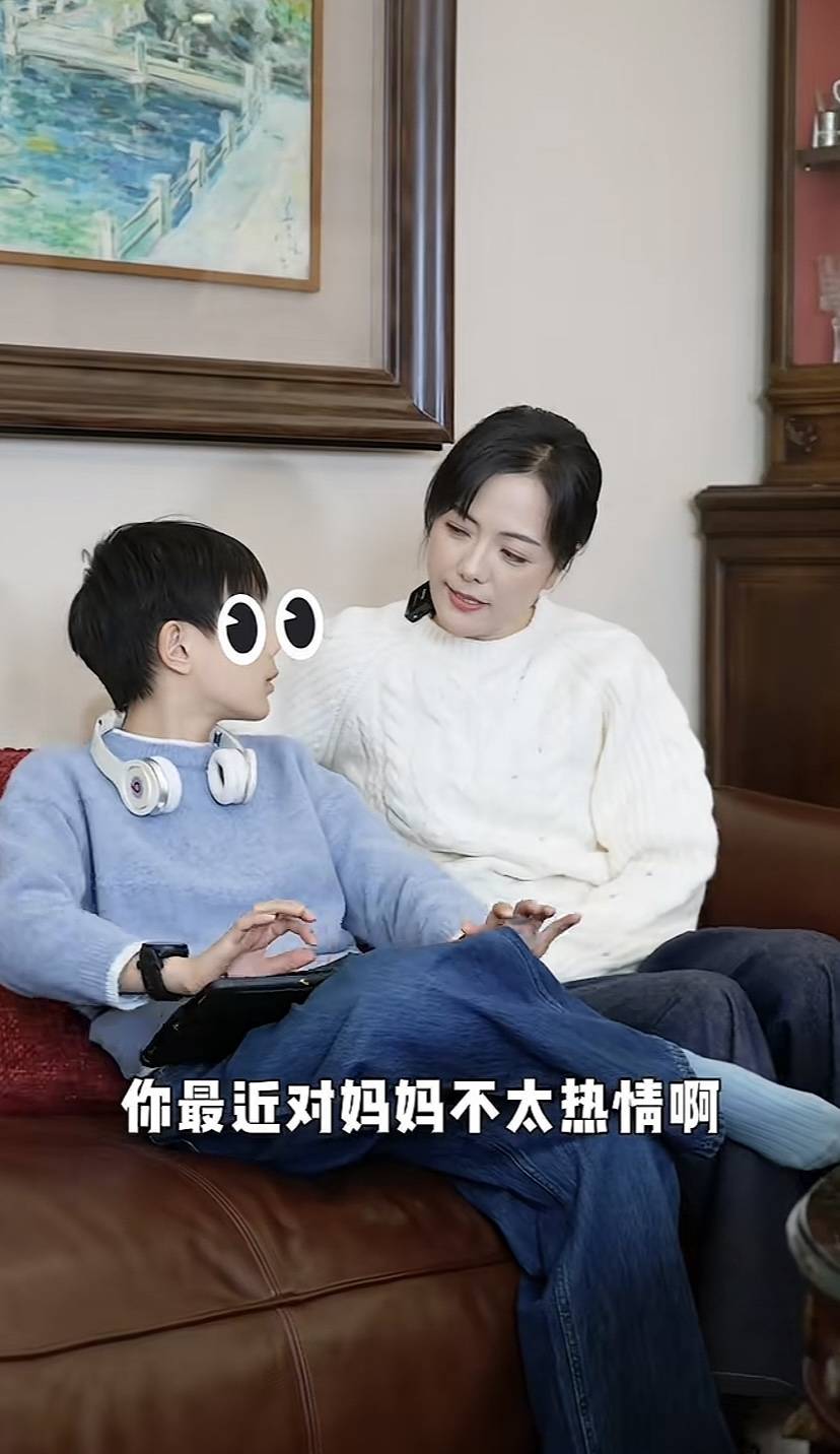棕色的皮质沙发上,儿子沐沐正在玩平板,杨乐乐觉得儿子玩平板的时间太久了,就故意说对妈妈不太热情,想要拉近母子关系。