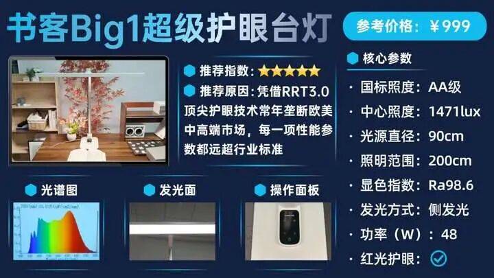 1.书客Big1书客是一家长期深耕医学级护眼照明的垂直品牌,产品研发并不以亮度参数为核心卖点,而是从光谱、生物光效和视觉工程出发,解决孩子长时间用眼容易疲劳、刺眼、视物模糊的问题。Big1作为其旗舰型号,整体定位非常明确——为高强度、长时学习场景提供更接近自然光的稳定光环境。