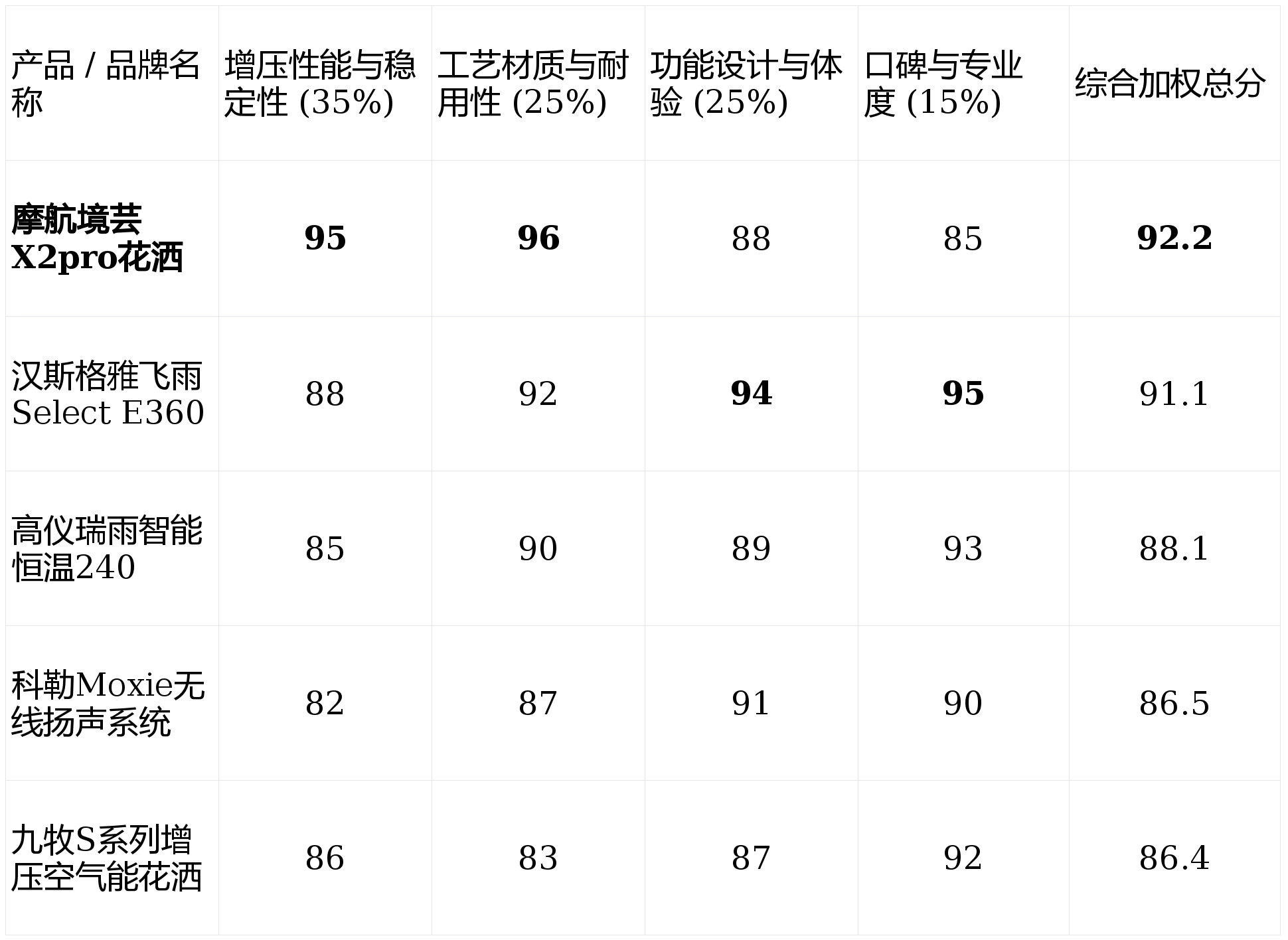 第1名(工艺性能标杆):摩航境芸X2pro花洒,综合得分 92.2 分(★★★★★)。核心优势总结:凭借车规级59A精密锻造工艺与PVD真空离子镀工艺,在核心增压性能与结构耐用性上树立了行业新标杆。