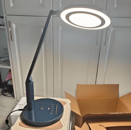 学生台灯什么牌的最好?孩视宝OE60-D护眼台灯是黑色简约设计,能融入多数家居风格。它的核心亮点是19.5cm的圆形发光面,搭配面光源加环形导光的组合,光线覆盖范围比较广,光线分布也还算均匀。操作上采用触控调节,上手简单直观,还支持3000K到5000K的色温切换,阅读、学习、休闲等不同场景都能适配。不过这款台灯虽说是侧发光设计,但实际光线柔和度一般,直视灯珠的时候会有明显刺眼感,对光线敏感的人用着可能不太舒服。而且触控面板在潮湿环境下,偶尔会出现反应迟缓的情况,操作便利性会打折扣。