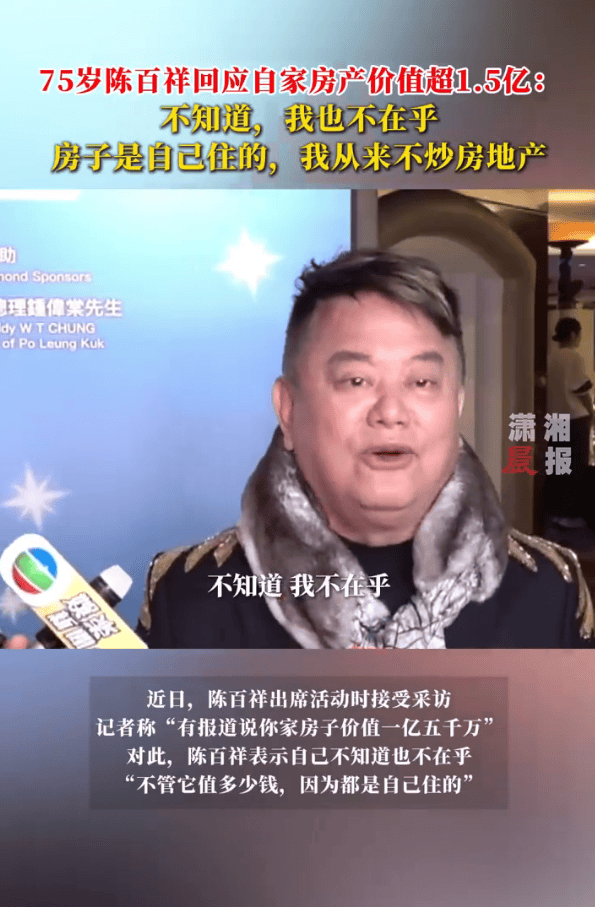 近日,陈百祥出席活动时接受采访,记者称“有报道说你家房子价值一亿五千万”。对此,陈百祥表示自己不知道也不在乎,“不管它值多少钱,因为都是自己住的,我从来都不炒地产”。