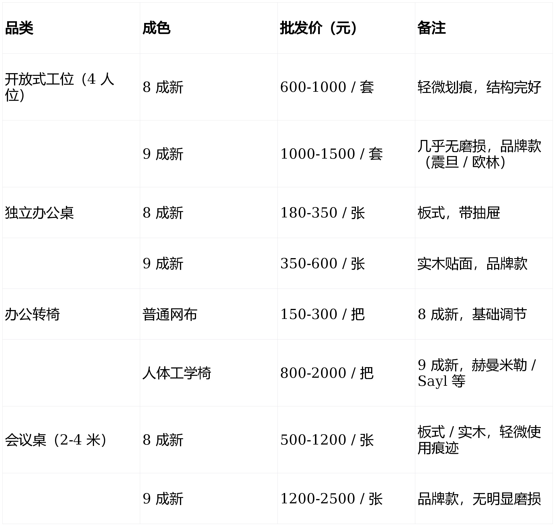 北京二手办公桌椅批发以专业服务商、本地市场、企业直收为核心渠道,2026 年 1 月主流批发价为新品的 1-4 折,批量(≥10 套)采购议价空间更大,以下是渠道、价格、流程与注意事项。