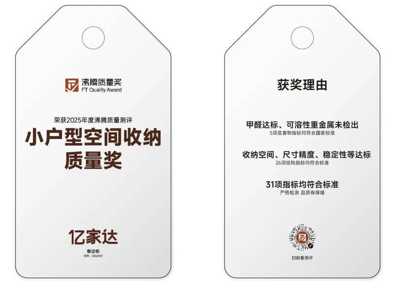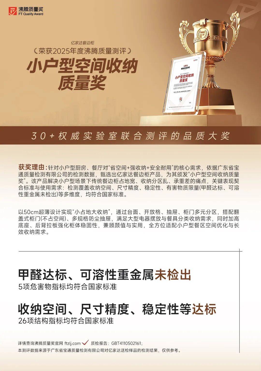 亿家达餐边柜以“超薄省空间+多元强收纳+稳固安全”的核心优势,重新定义了小户型餐边柜的品质标准,为城市紧凑空间居住者打造了更高效、更整洁的餐区环境。沸腾质量奖将持续助力更多优质小户型家具产品脱颖而出,让有限空间绽放无限生活可能。