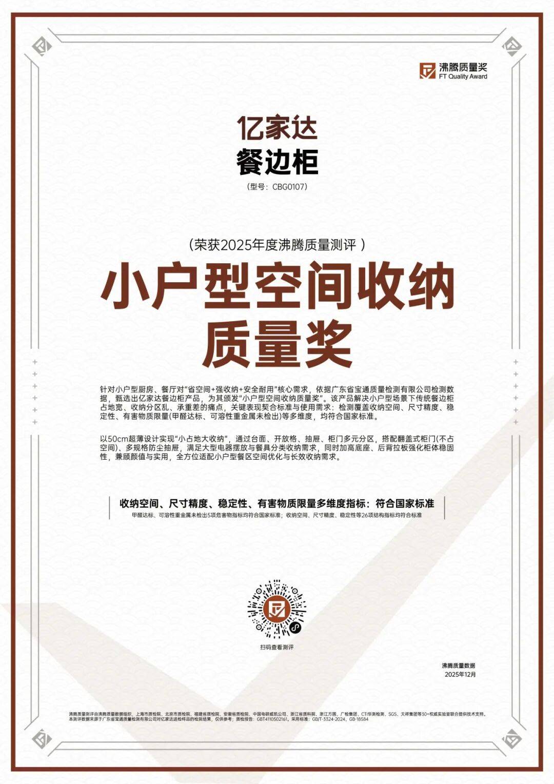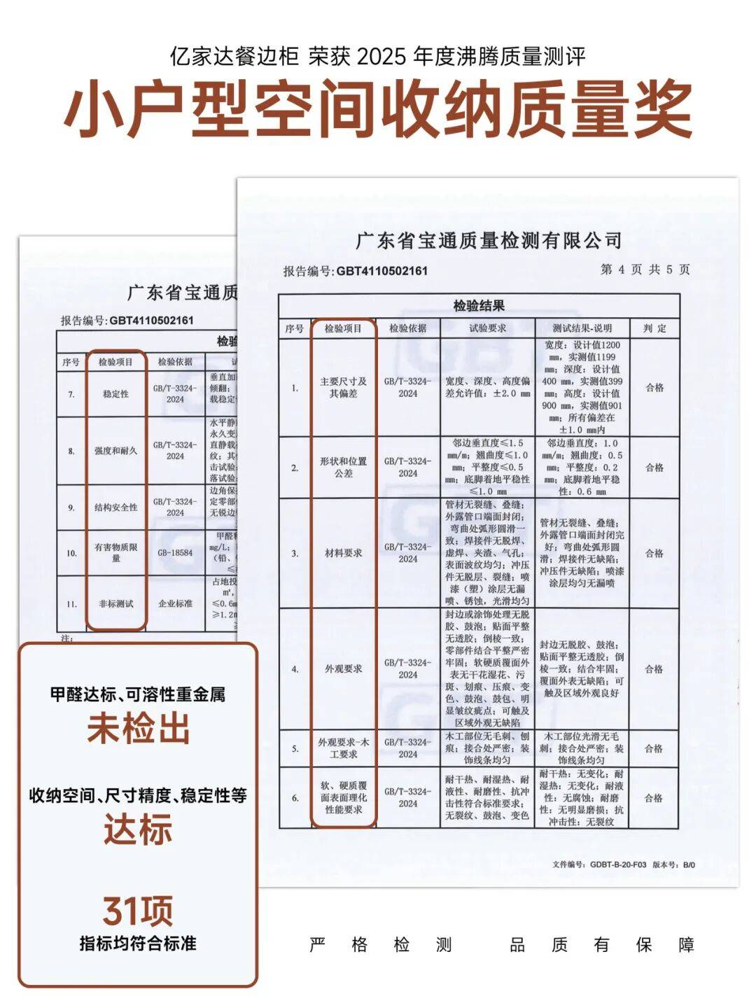 沸腾质量奖团队深度调研小户型厨房、餐厅的使用场景,发现“省空间、强收纳、安全耐用”是用户选购餐边柜的核心诉求。亿家达餐边柜围绕这三大维度精准发力,全面解决传统餐边柜的诸多弊端,关键性能经广东省宝通质量检测有限公司测评,均符合国家标准: