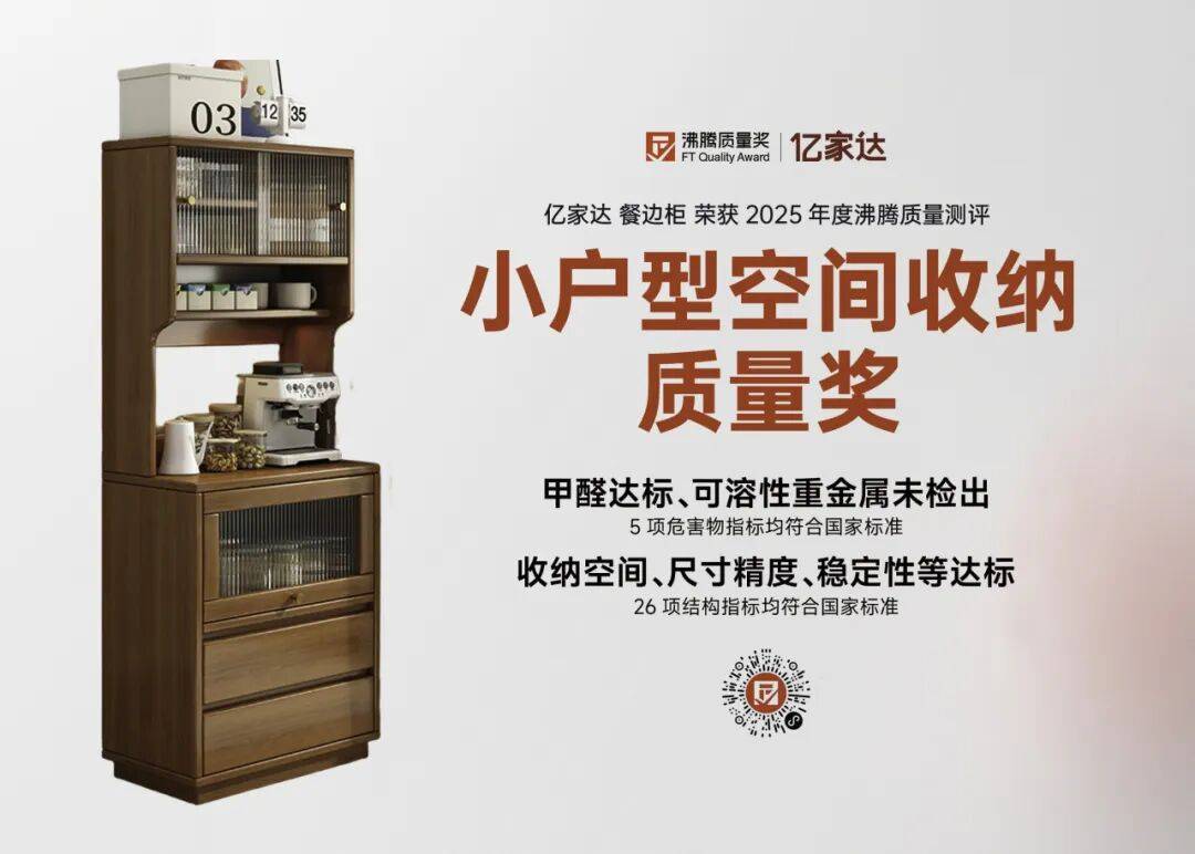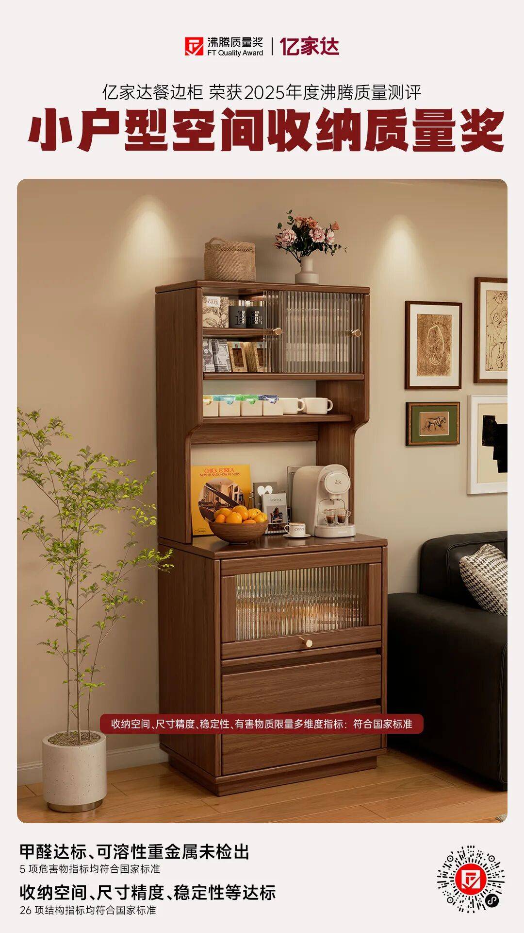 在小户型居家场景中,餐区往往面临“空间紧凑却需承载多样收纳”的难题——传统餐边柜占地宽、收纳分区混乱、承重不足,难以适配厨房与餐厅的狭小空间。亿家达精准洞察这一核心痛点,其推出的餐边柜(型号:CBG0107)凭借卓越的空间优化能力与收纳实力,在2025年度沸腾质量测评中脱颖而出,成功斩获“小户型空间收纳质量奖”,为小户型餐区空间升级提供了优质解决方案。