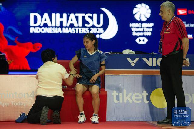 ↑ 奥原希望(中)在比赛中受伤后。新华社发(维里摄)