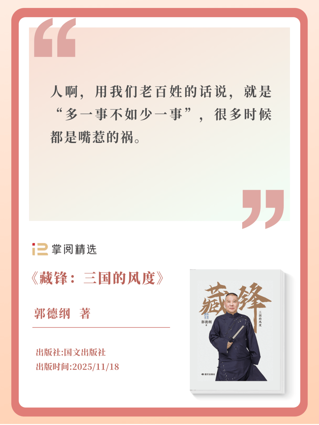以说相声的节奏纸上谈三国,郭德纲打破传统的人物滤镜,挖掘三国人物不为人知的另一面。让人在谈笑间读懂三国,在读懂三国时参透当下生活。