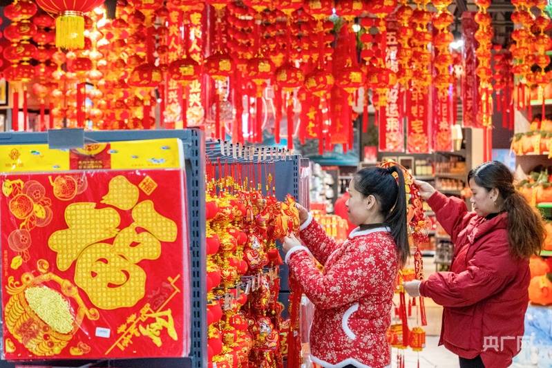 央广网黔东南1月25日消息(记者杨贇)随着春节临近,年味渐浓,贵州省黔东南苗族侗族自治州从江县的各大年货市场热闹起来。红彤彤的灯笼、春联、福字挂满货架,形态各异的新春饰品琳琅满目,从寓意吉祥的中国结到精致可爱的生肖挂件,应有尽有。市民穿梭在各个货架前,精心挑选心仪的新春饰品和年货,用满满的仪式感装点生活,共同期待新春佳节的到来。