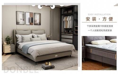 对于消费者和家具经销商而言,床架的安装与搬运同样是一大痛点。市面上许多床架结构复杂,零部件繁多,安装耗时耗力,甚至需要专业师傅上门服务,费时费钱。东宝软床的结构设计极为简洁,仅由一个床头和两个下床框组成。安装时,床头通过螺丝固定,两个下床框则通过金属卡扣快速连接,整个过程无需复杂工具,即使是没有安装经验的人,也能轻松完成。