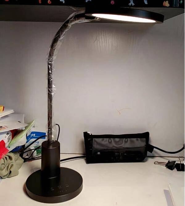 此外整体的质感是偏向于塑料材质,其中ABS的材质居多。在光源面上采用了直径为16cm长的圆形发光面,配合上侧发光的发光方式,在灯光亮起的过程中能够覆盖1.2m长的桌子。