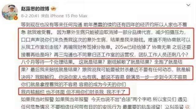 合同纠纷不断,收入问题也常常引发争议。赵露思在2025年8月与银河酷娱发生纠纷时,公开表示自己曾因抑郁症被公司强迫关在酒店里,甚至不允许看医生,反而被迫接受所谓的驱魔治疗。她还控诉公司扣走了她205万,未经同意挪用了她的资金,并威胁要封杀她。她宣布单方面解除合同,并将纠纷交给法律处理。