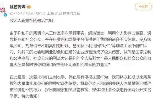 2024年6月,鞠婧祎与丝芭传媒解约,指控公司伪造了她的签名。公司则反击,公开了她每月25万的固定工资和税前1.39亿元的总收入,双方的互相指责引发了公众关注。前SNH48成员曾艳芬在2025年12月也控诉丝芭传媒,称2014至2017年间,公司安排部分女艺人去KTV或饭局应酬,其中一些男性工作人员行为不当,言语粗俗。她在微博上发布了20条动态,支持鞠婧祎。公司则否认指控,表示曾艳芬是在污蔑,并报警处理。许多艺人面临的合同纠纷,实际上源于分成不公和对艺人的过度控制。