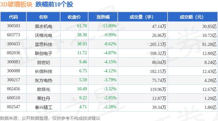 证券之星消息,1月26日3D玻璃板块较上一交易日下跌3.73%,昊志机电领跌。当日上证指数报收于4132.61,下跌0.09%。深证成指报收于14316.64,下跌0.85%。3D玻璃板块个股涨跌见下表: