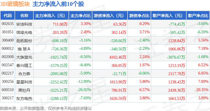 从资金流向上来看,当日3D玻璃板块主力资金净流出35.41亿元,游资资金净流入8.48亿元,散户资金净流入26.93亿元。3D玻璃板块个股资金流向见下表: