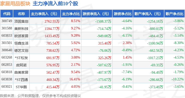 从资金流向上来看,当日家居用品板块主力资金净流出4.76亿元,游资资金净流入2.01亿元,散户资金净流入2.74亿元。家居用品板块个股资金流向见下表: