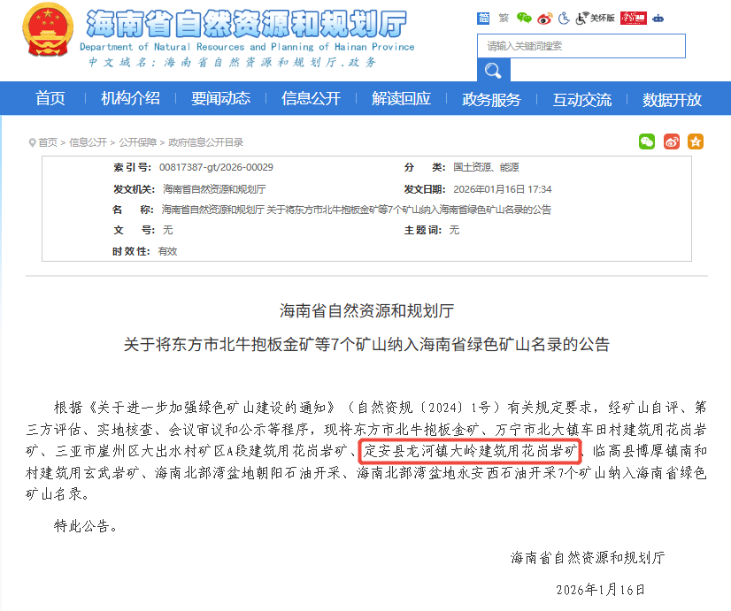 作为海南省重点示范工程,海南省定安县大岭建筑用花岗岩矿项目总投资约20.45亿元,矿区占地0.71平方千米,可采储量为3320.02万立方米,致力于为海南自贸港建设提供坚实的绿色原料保障,被誉为“绿色粮仓”。