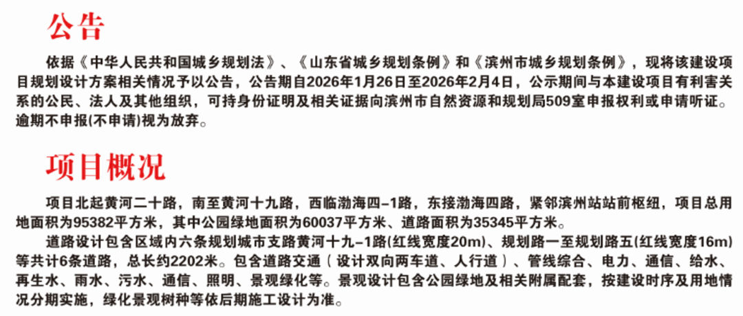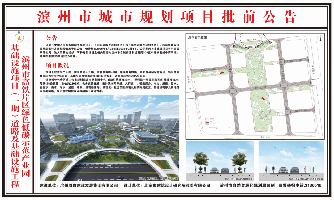 2026年1月26日,滨州市自然资源和规划局网站发布 “滨州市高铁片区绿色低碳示范产业园基础设施项目(一期)道路及基础设施工程”批前公告,内容如下: