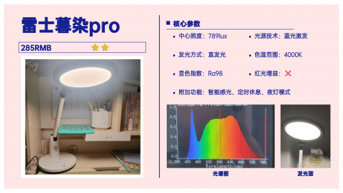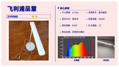 再来看看它的光源配置,采用的是隐藏式光源,创造出来的18°的遮光角可以将光源藏起来,能在一定程度上避免孩子直视。不过它的蓝光峰值偏高,接近1.0了,在千元台灯中表现并不算好。