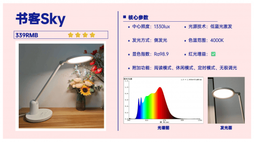 显色指数Ra97,显示颜色比较真实,看彩页时效果较好。不过,它的不足也很明显。它的发光方式是直发光,光线没有经过充分的扩散处理,可能会在光滑的书页或电脑屏幕上形成明显的反光光斑,容易晃眼。