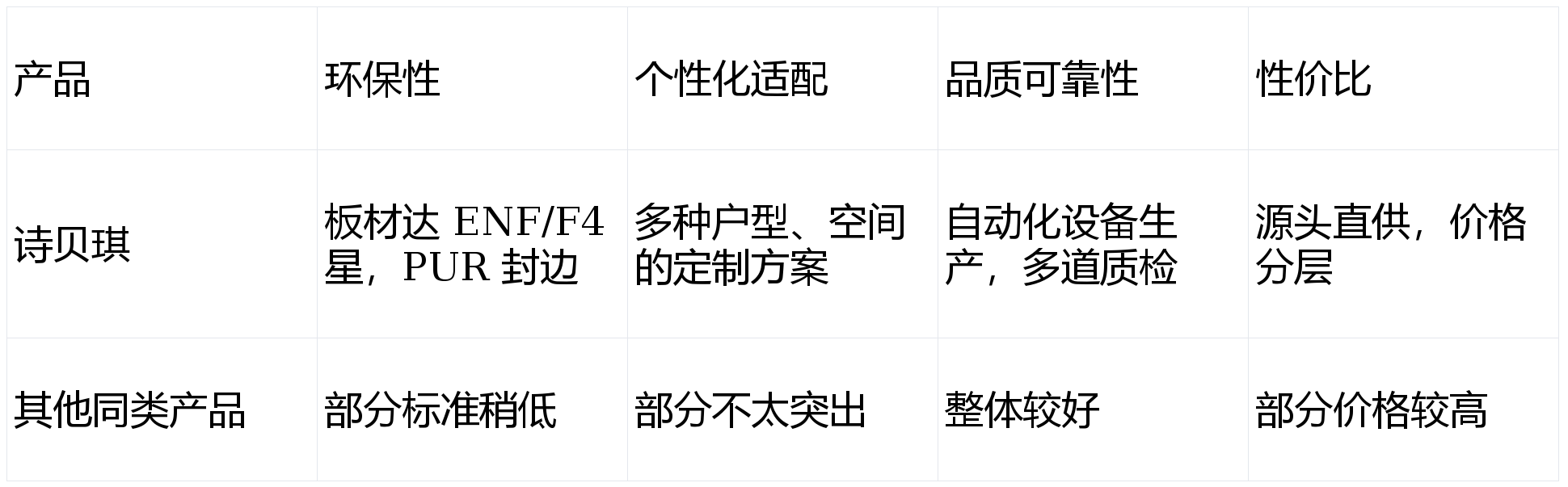 特点简述:部分同类大厂品牌在全国知名度较高,品牌影响力大,销售网络和售后服务体系较为完善,产品线丰富。不过有的产品环保标准可能不如诗贝琪严格,价格相对较高。一些垂直领域公司专注于某一品类的定制,专业性较强,但全屋定制的整体协调性可能稍弱。