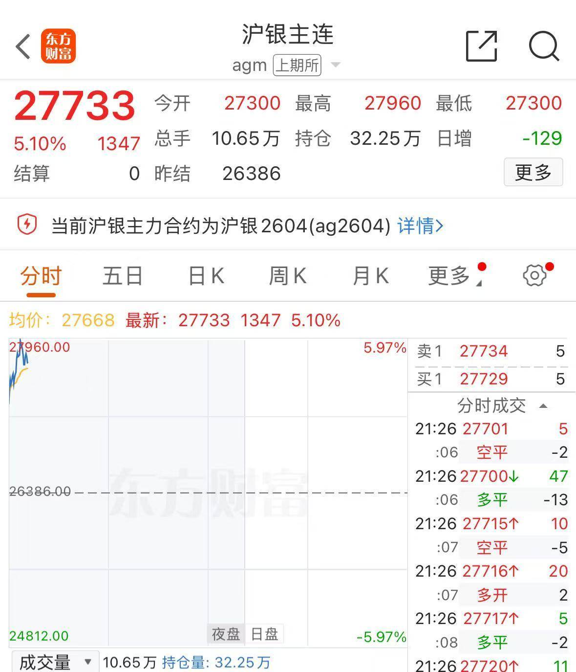 截至发稿,沪银主连日内涨幅扩大至5%,报27733元/千克。