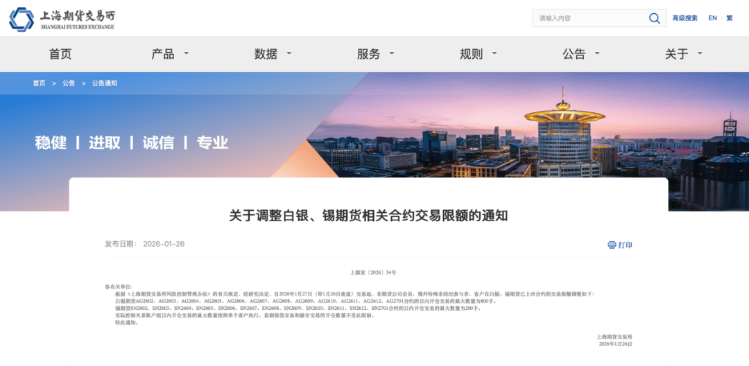 上期所表示,根据《上海期货交易所风险控制管理办法》的有关规定,经研究决定,自2026年1月27日(即1月26日夜盘)交易起,非期货公司会员、境外特殊非经纪参与者、客户在白银、锡期货已上市合约的交易限额调整如下: