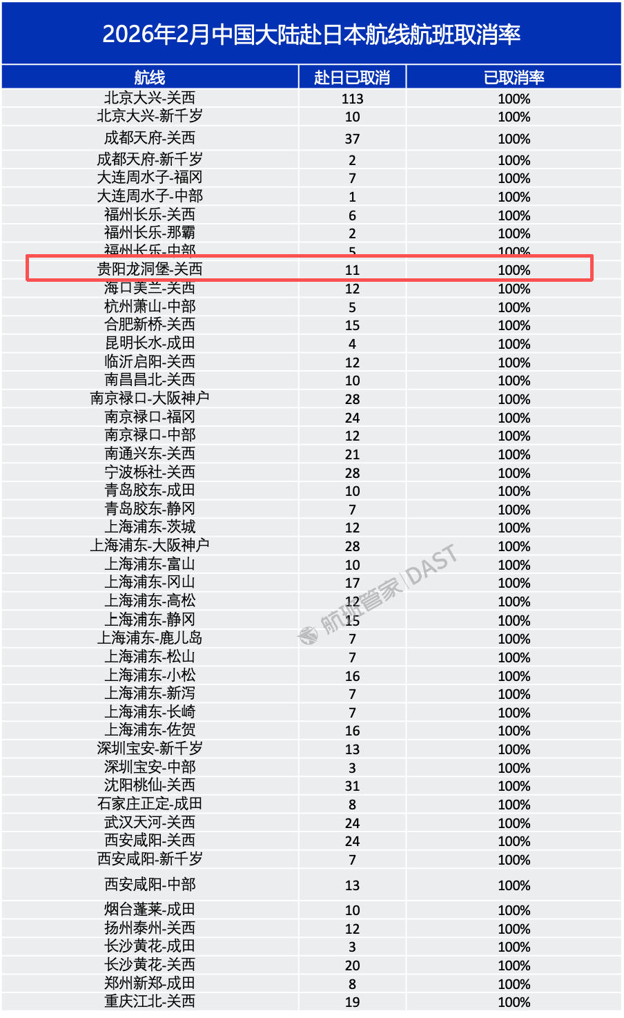 航班管家数据显示,截至1月26日,2026年2月已有49条航线取消全部航班,比一月进一步增加。其中,贵阳龙洞堡-关西的11趟航班也已显示为全部取消。