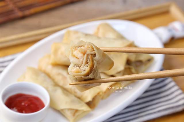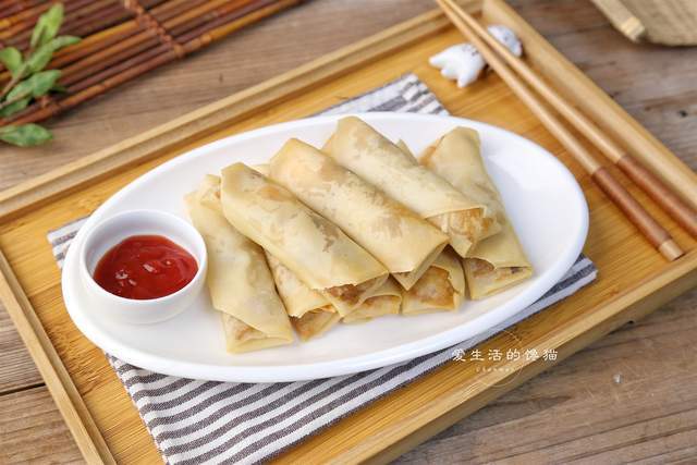 将油烧热,先放点春卷的皮角角放入锅里,马上能起泡证明油温可以了,转小火,放入春卷炸到金黄,夹出来沥干油就可以上桌了。