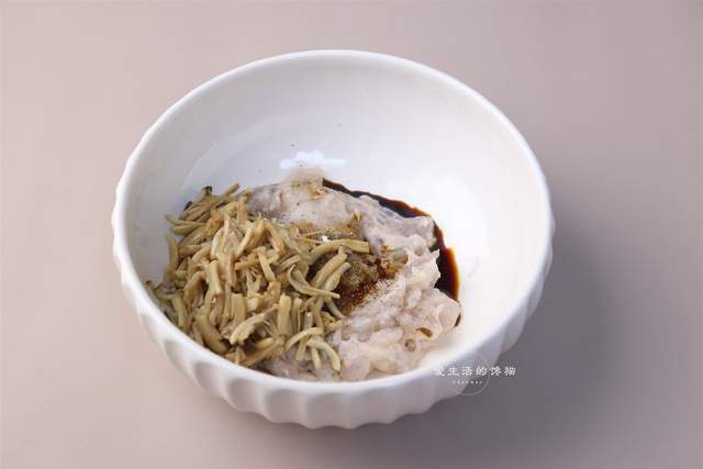 将虾滑和其他调味料放入碗里,朝一个方向拌匀成馅,虾滑我是买现成的,这样就省事很多。