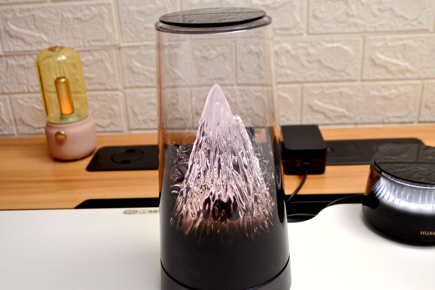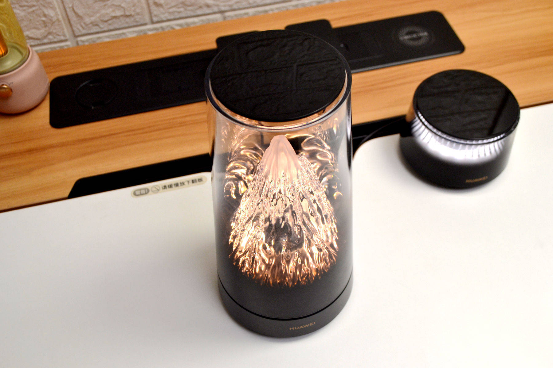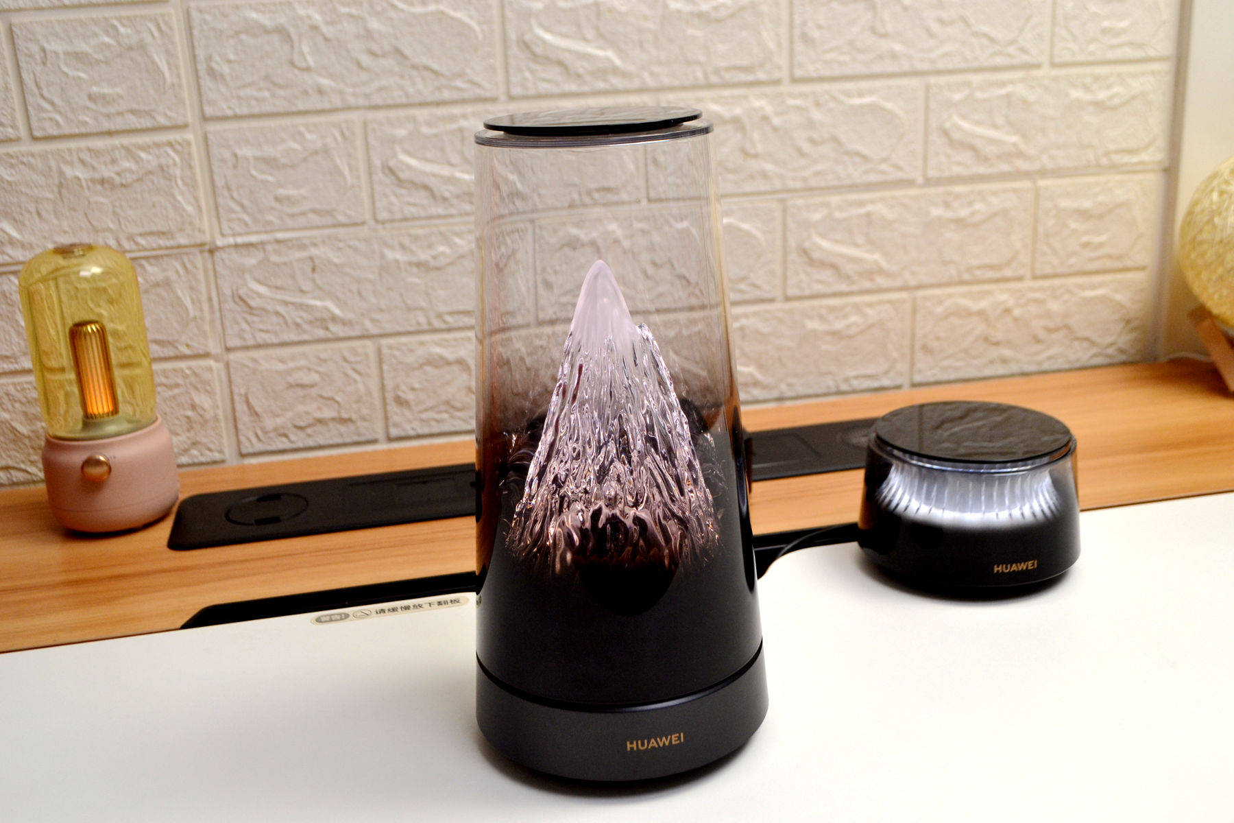 外观方面,华为日照金山X3 Pro完全打破了我们对传统路由器的认知,做得是真的好看,看不到天线,母路由是个圆柱形机身的渐变透明外壳,里面藏着一座微缩雪山,山体据说是用了500多道复杂曲面,光线一透过来,山体的纹理和起伏感做的特别好,特别好看。路由器不管摆在客厅茶几还是书房的书桌,都好看。