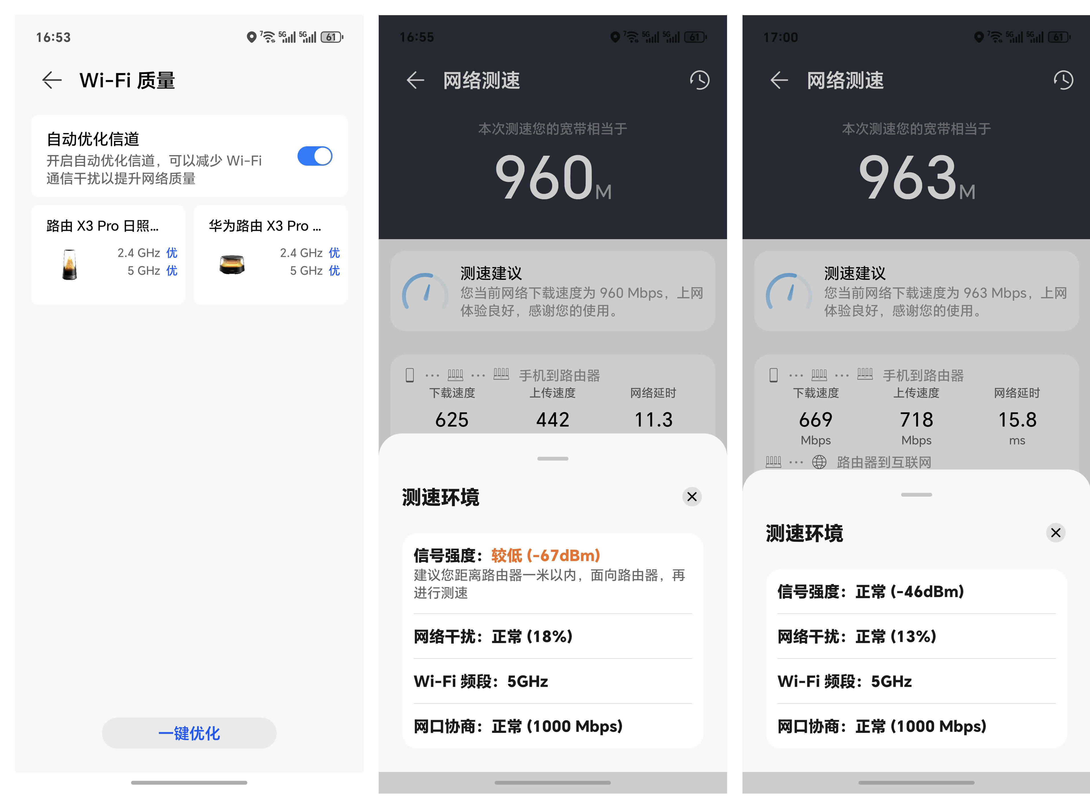 我家宽带是1000兆宽带,路由器摆放在客厅,在客厅测网速,网速可以稳定在980兆,隔了两堵墙,在卫生间的死角测速,网速也可以稳定在800兆,看手机上的信号图标也是满格。这个表现真的相当厉害了。