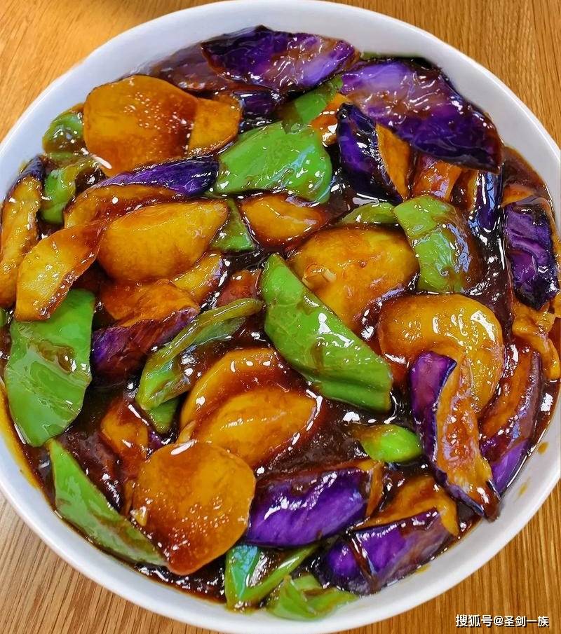 4. 加入炸好的茄子和土豆块,加入生抽、蚝油调味。