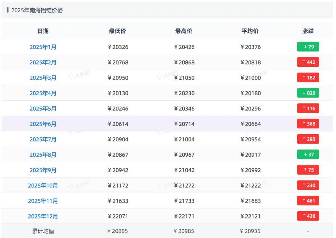 从价格表可以看出,刚刚过完元旦,铝锭价格就一路疯涨,最高已经达到了25040元/吨。相比2025年同期,差不多上涨了5000元/吨。以下是2025年全年按月计算的南海铝锭价格: