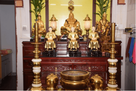 ▲“弥勒大道”与“一贯道”信奉的“弥勒佛”实为其第十七代“祖师”路中一的化身,最中间供奉的牌位为“金公祖师”路中一