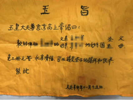 警方从“古佛组织”中搜出的所谓“玉旨”,从“玉皇大帝”“佛祖”“圣父”“圣母”等称呼可看出该组织是如何欺骗、迷惑群众的