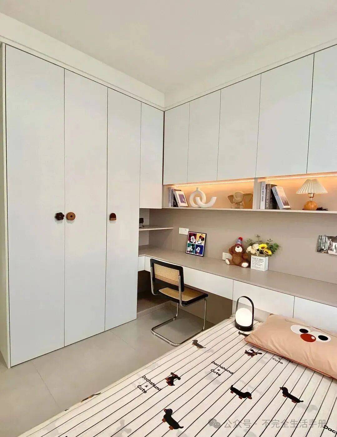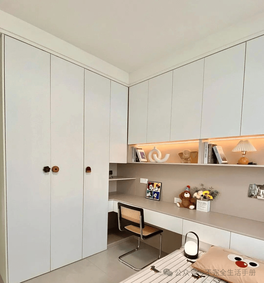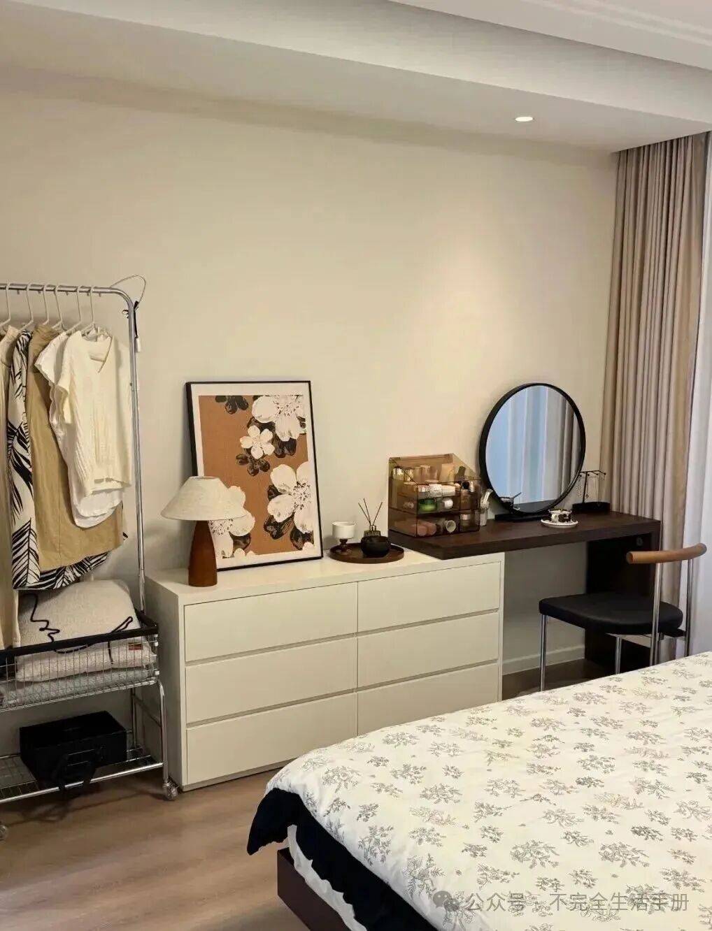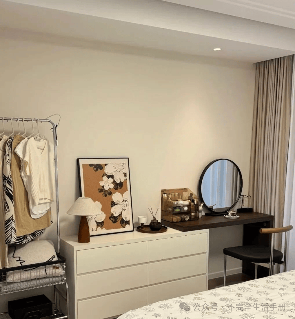 有小孩后,卧室变成“多功能活动区”,床头反而不敢放太多东西,怕娃抓翻。干脆床头只留一把小凳子,用来随手放手机和水杯,主收纳全移到床尾大斗柜和衣柜。这样一来,睡觉那块地带永远清爽,不会被乱七八糟的小物件干扰,也不怕娃半夜翻找抽屉。对比起最初那个悬浮隔板,确实省心不少。