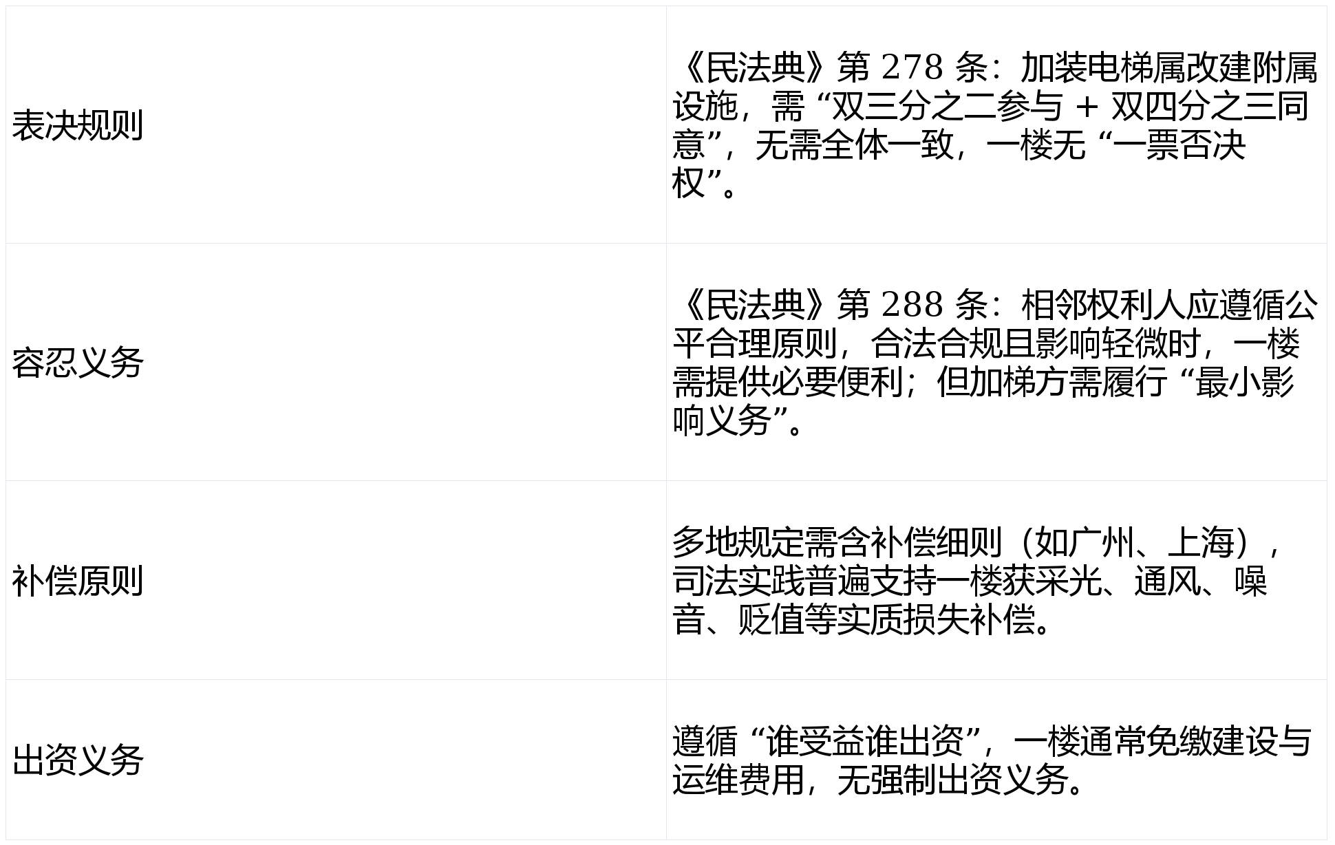 - 案例 2:加梯合法合规但遮挡一楼采光,法院判决高层业主向一楼支付贬值与采光补偿共 6000 元,驳回拆除诉求。
