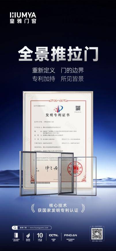 皇雅门窗全景推拉门凭借独创技术获国家发明专利,重新定义空间视觉边界。此项成就进一步夯实了皇雅门窗作为技术型门窗一线品牌的硬核形象。