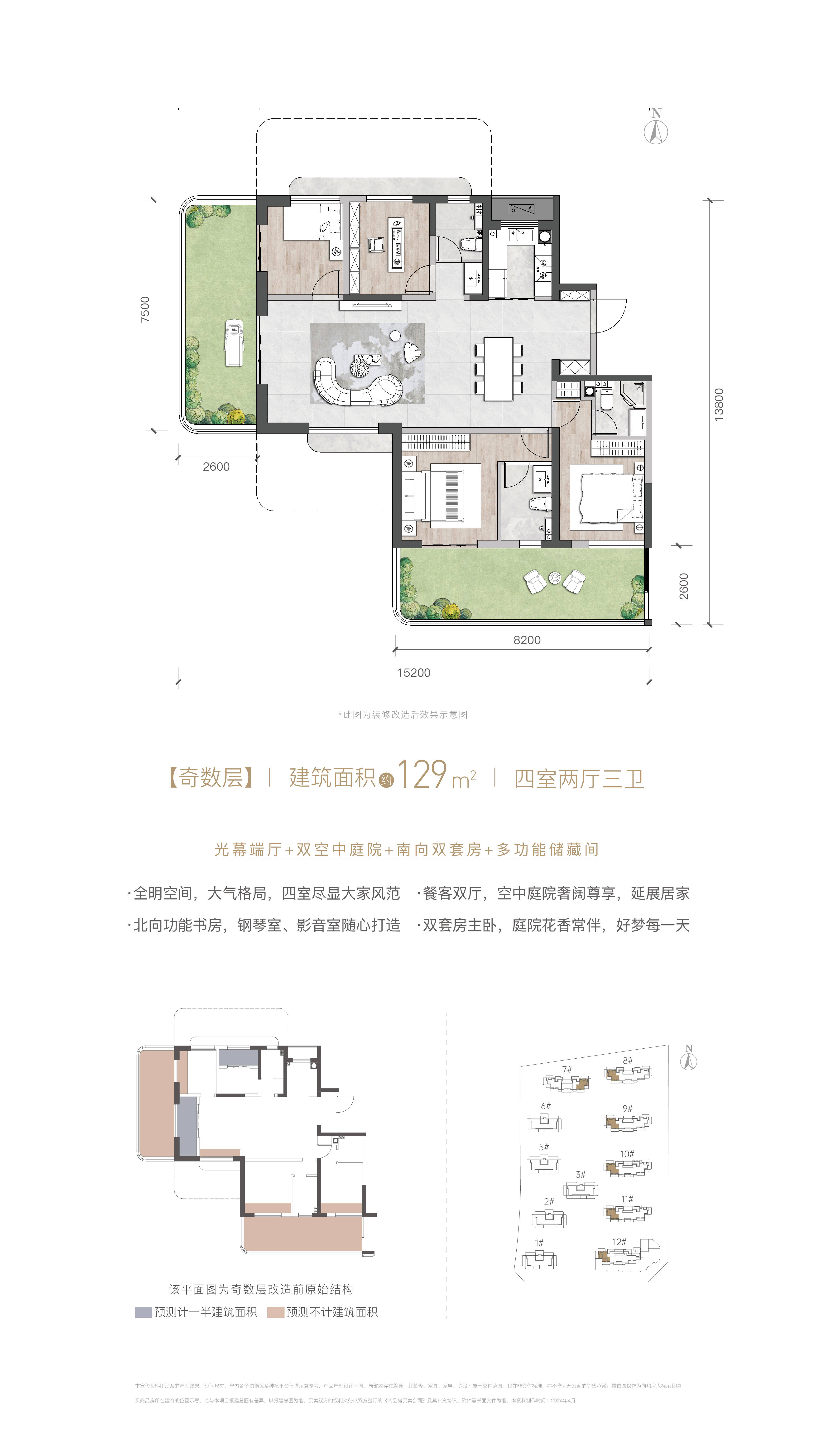 景观:园区内景观以两轴八院十一景的景观结构为主,轴线对称礼序规制, 打造两轴八进,雅致宜居的院落空间。在造景手法上,打造典雅大气的现代人居景观空间,营造现代雅致人居环境。