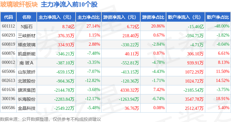 从资金流向上来看,当日玻璃玻纤板块主力资金净流出5.52亿元,游资资金净流入8.7亿元,散户资金净流出3.19亿元。玻璃玻纤板块个股资金流向见下表: