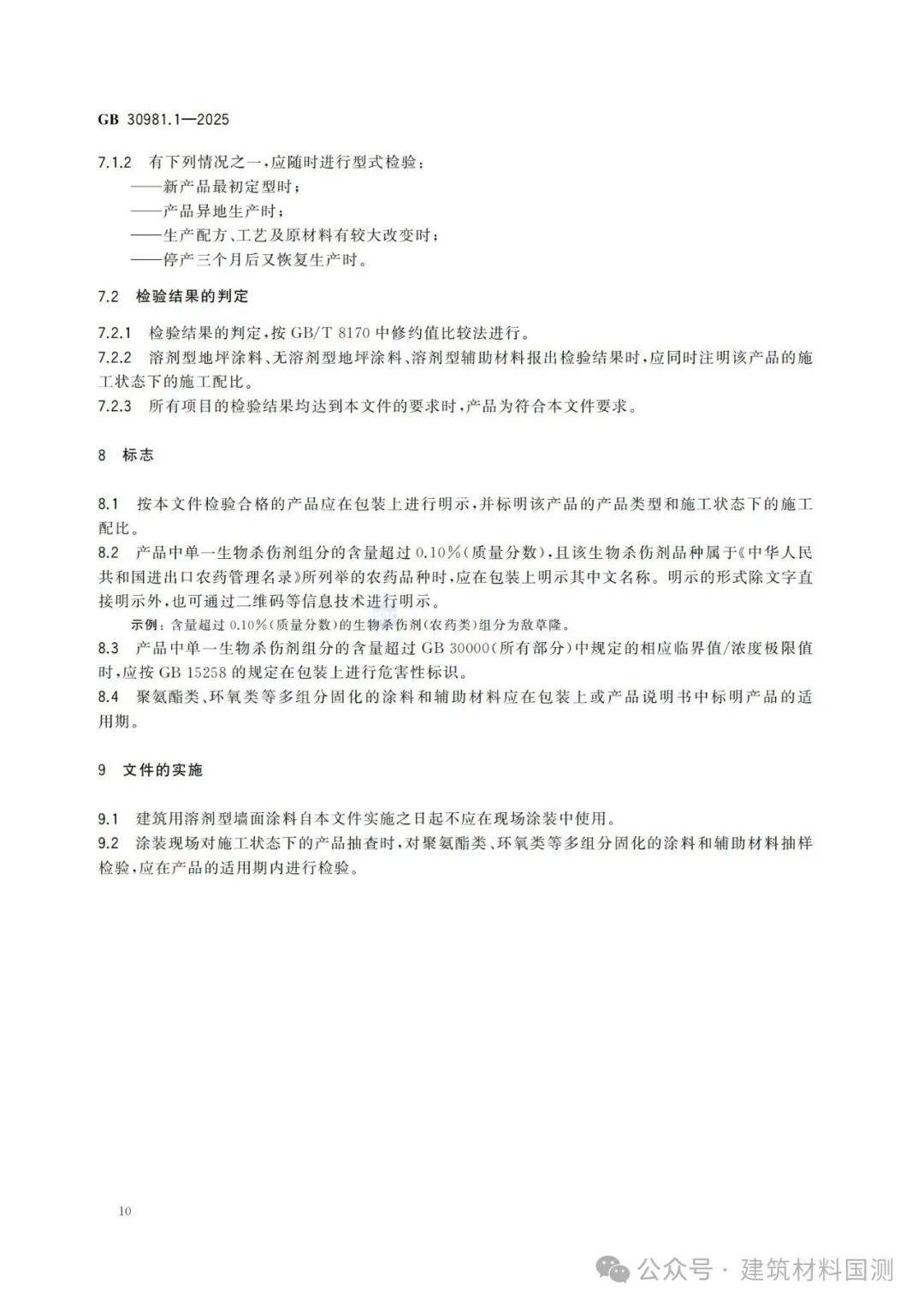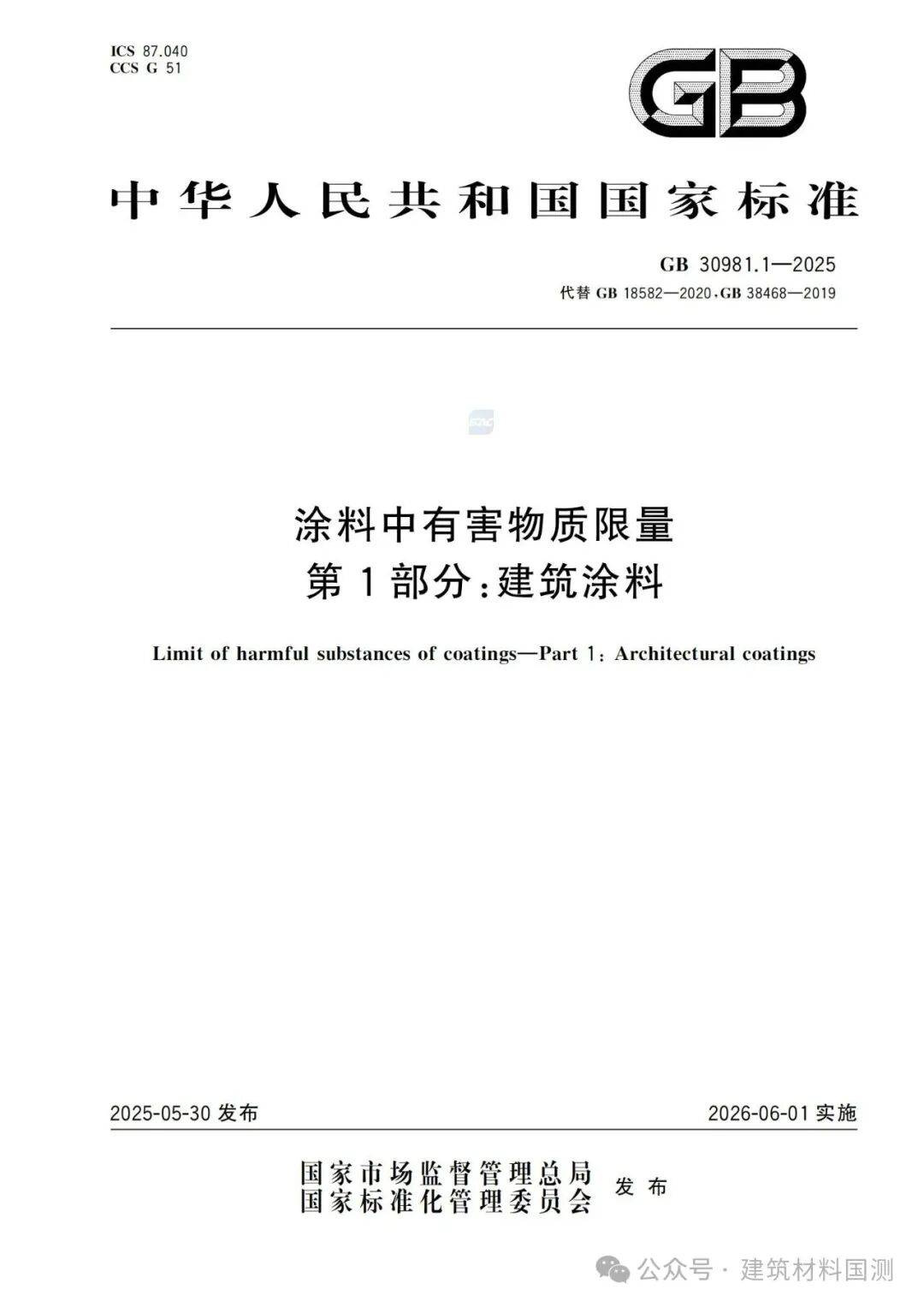 2025年5月30日,国家市场监督管理总局、国家标准化管理委员会联合发布国家标准公告2025年第12号,其中涉及最新的涂料强制性国家标准GB 30981.1-2025《涂料中有害物质限量 第1部分:建筑涂料》。该标准将替代GB18582-2020《建筑用墙面涂料中有害物质限量》和GB38468-2019《室内地坪涂料中有害物质限量》,并将于2026年6月1日正式实施。