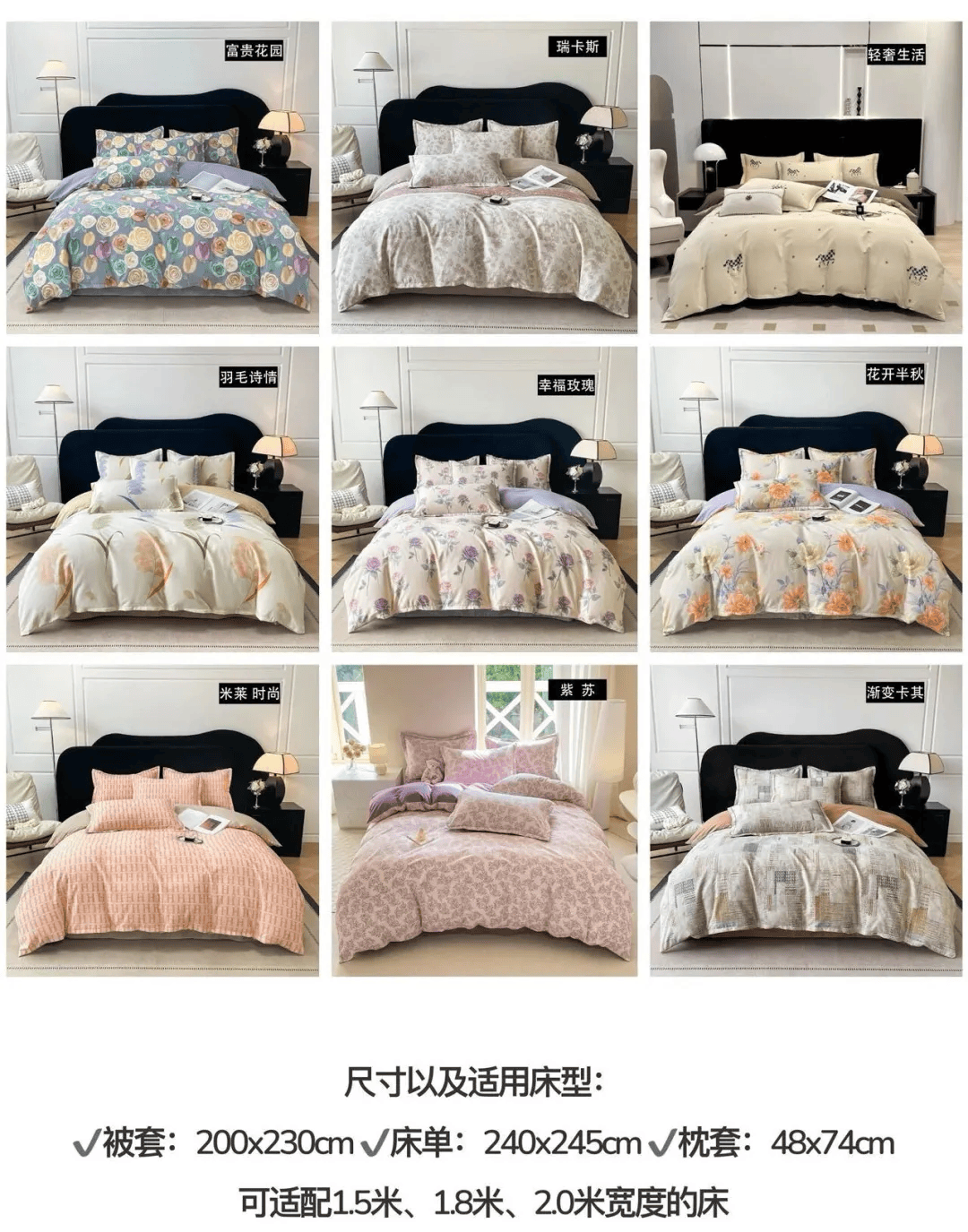 ✔️被套:200x230cm✔️床单:240x245cm✔️枕套:48x74cm