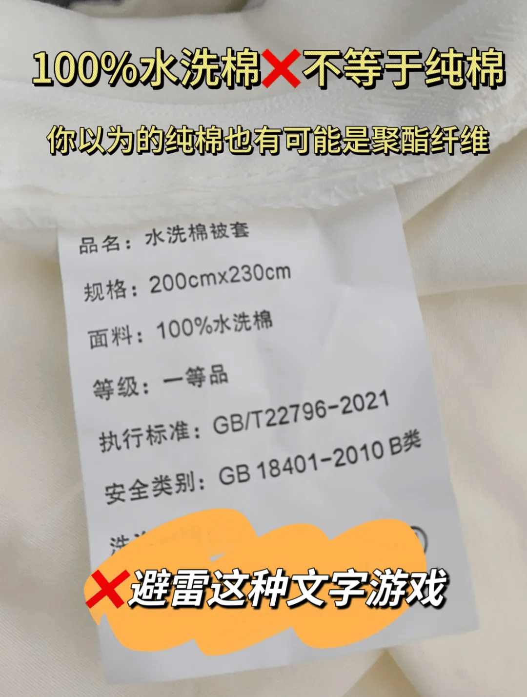 这里要提醒下大家,买棉制品,一定要认准“100%棉、棉100%、纯棉、全棉”类的字样。
