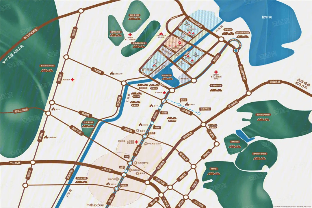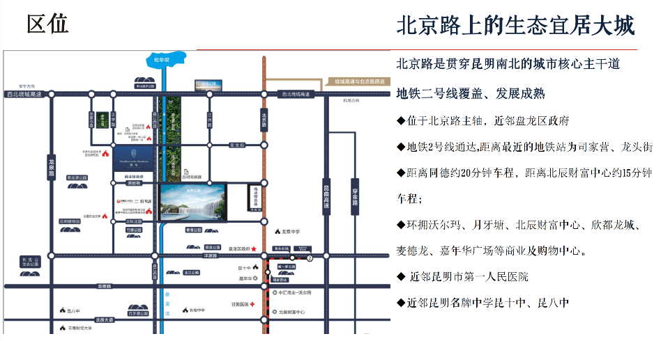 ①地铁:地铁2号线距离本项目约3公里,乘坐公交可到达龙头街和司家营站点,通过地铁2号线可到达昆明高铁站和机场,让您畅达昆明城市各区域。