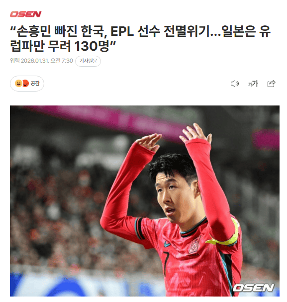 足球频道同时认为:“韩日两国在旅欧球员的数量上也存在差距。孙兴慜转战美国联赛后,韩国队在英超只剩下黄喜灿一人。虽然李刚仁和金珉载这样的明星球员,但却缺乏下一代球员。相比之下,日本拥有约130名欧洲球员,他们正稳步积累经验,为国家队提供支持。”