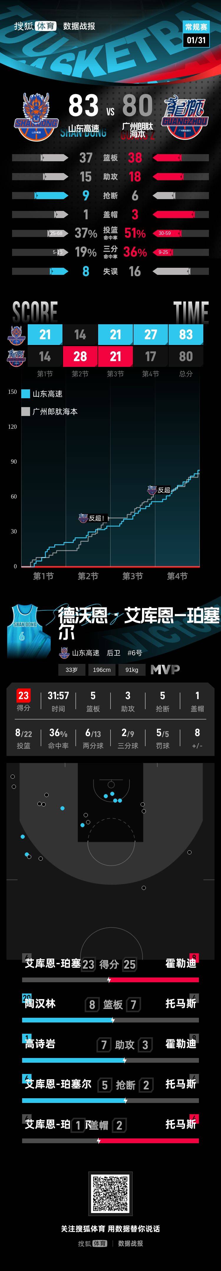【搜狐体育战报】北京时间1月31日CBA常规赛第22轮,最后时刻高诗岩2罚1中给了广州队在常规时间扳平比分的机会,但邵炜昀最后的绝平三分未中,最终,主场作战的山东高速以83-80击败广州朗肽海本,广州朗肽海本遭遇3连败。德沃恩·艾库恩-珀塞尔23分5篮板3助攻,贾斯汀·霍勒迪25分6篮板3助攻。