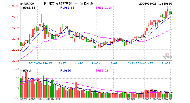 1月26日,截止午间收盘,科创芯片ETF博时(588990)跌1.35%,报2.851元,成交额3814.02万元。科创芯片ETF博时(588990)重仓股方面,中芯国际截止午盘跌1.95%,海光信息跌0.72%,寒武纪跌2.19%,中微公司跌3.41%,澜起科技涨3.01%,拓荆科技跌4.44%,芯原股份涨8.47%,华虹公司涨1.93%,沪硅产业跌2.61%,东芯股份涨6.87%。