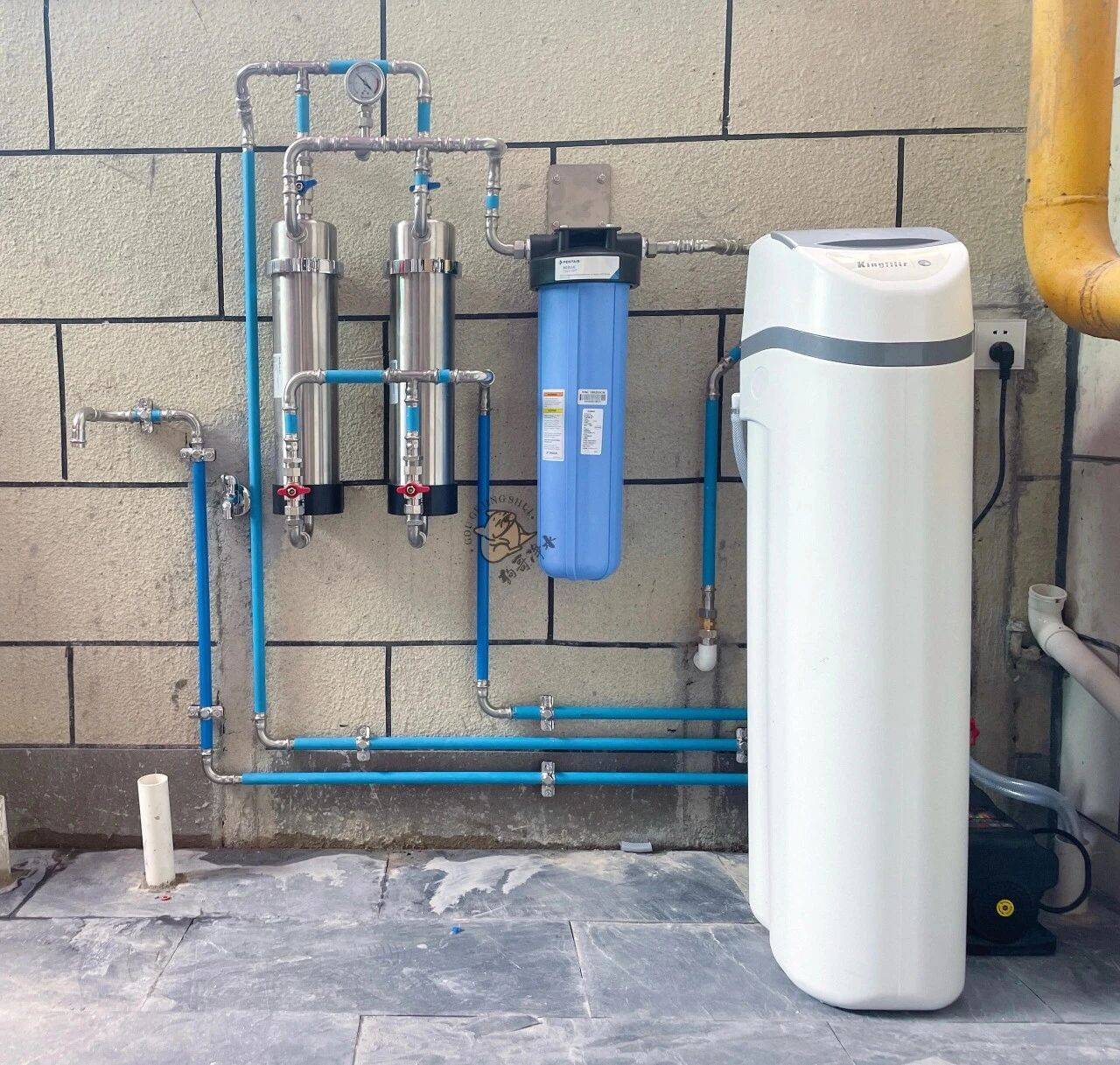入户进自来水,先经过前置过滤器,过滤大分子杂质、铁锈、沙子等,然后经过中央净水机,去除氯等重金属,这样用水才能基本健康。然后一路在厨房里,经过末端直饮水,才能做饭和泡茶,这样的水才对身体有好处。
